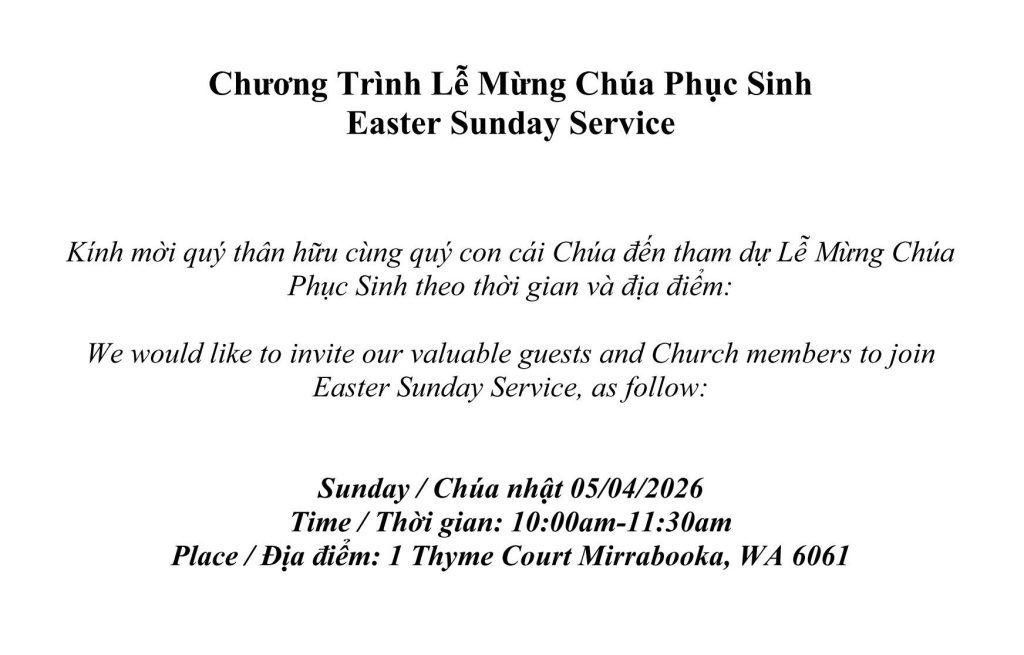 tại: Nhà Thờ Tin Lành Perth – 01 Thyme Ct, Mirrabooka, WA